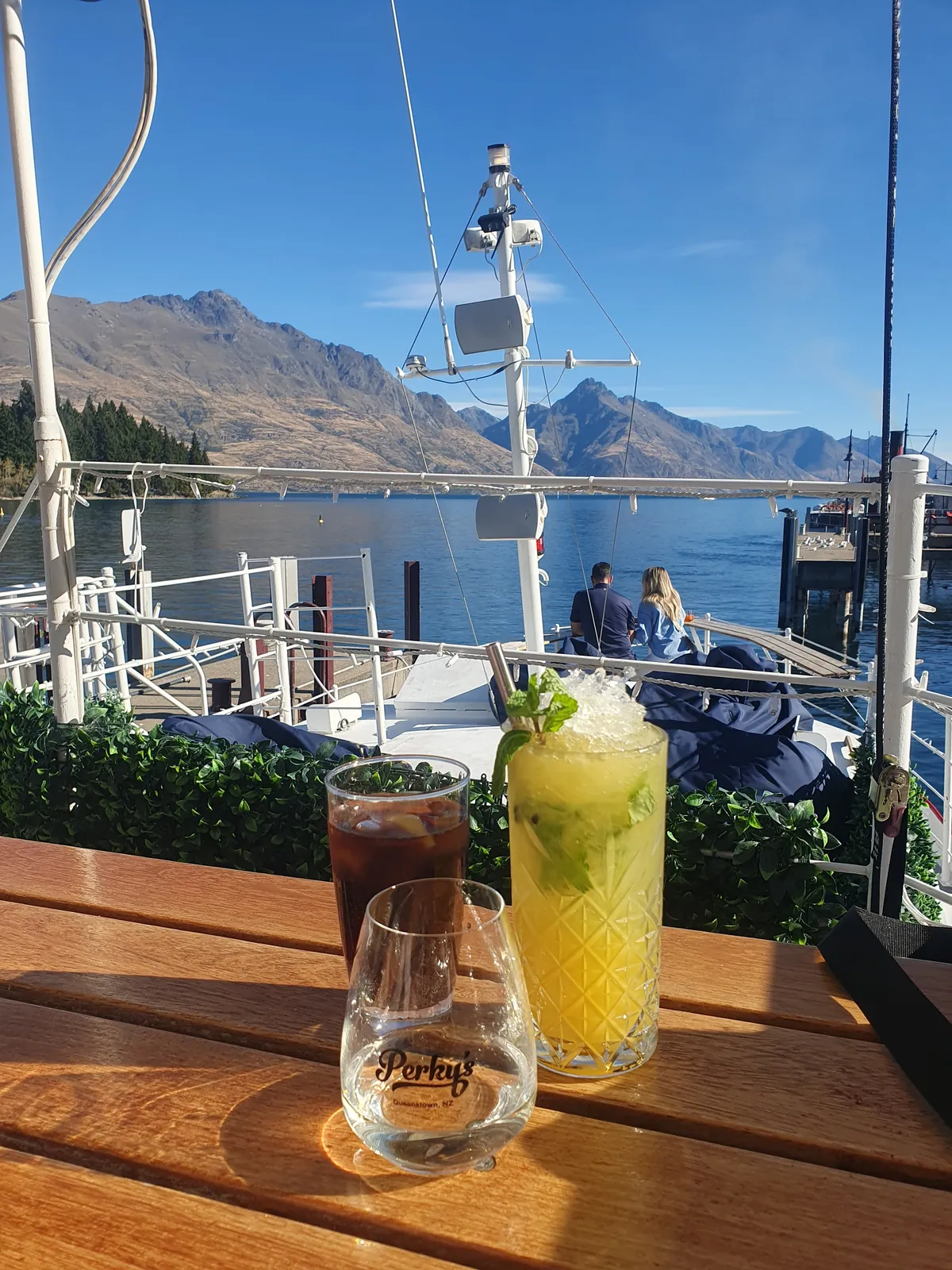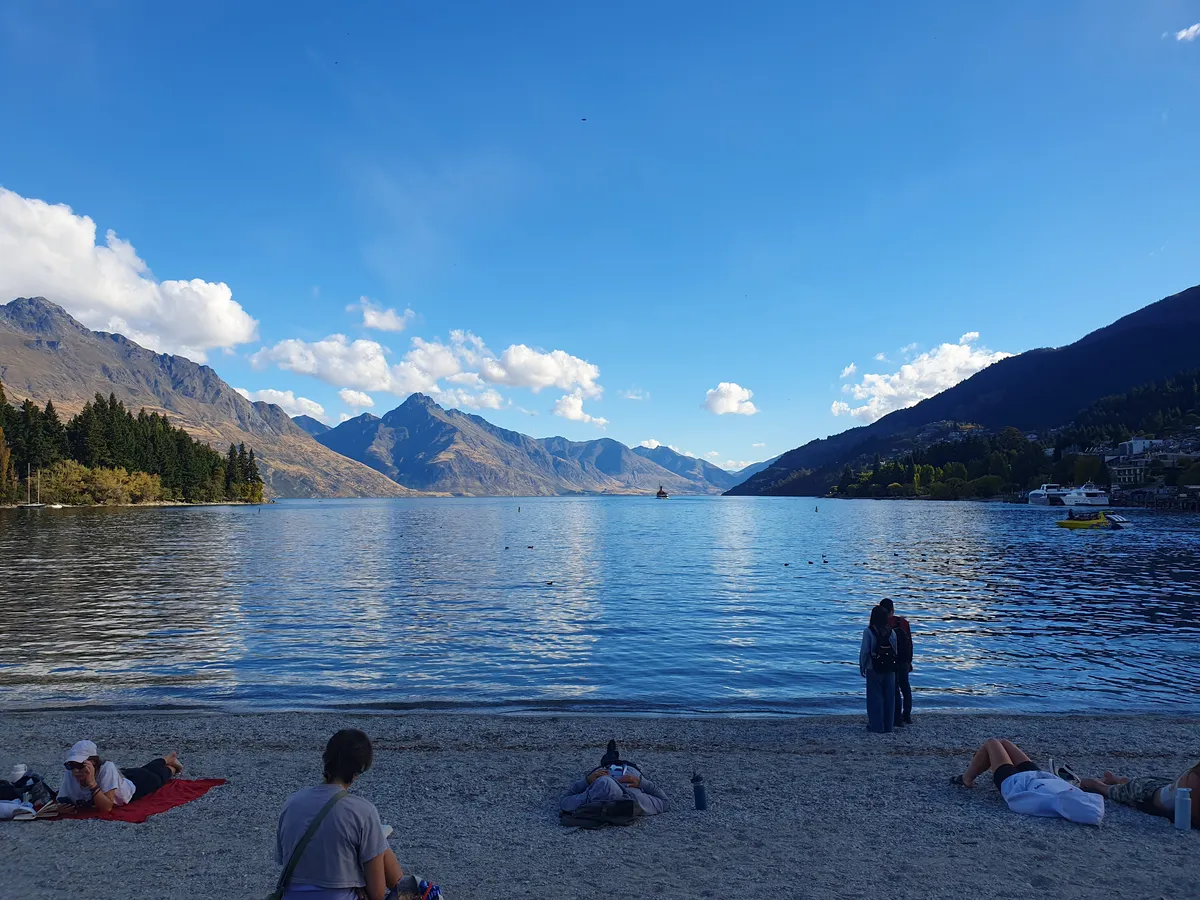 The shore of Lake Wakatipu glistened along a small beach—almost making us think we were on the coast, rather than nestled inside a mountain range the furthest south we've ever been in the world. People gathered on this beach sunbathing, reading and chatting. Along the waterfront, bars opened up their outdoor seating areas, food stalls dotted the footpath, restaurants set out their menus and everyone around us seemed so busy relaxing. Adverts for water-based adventures dotted the lakefront, and hints to other daytime adrenaline-inducing activities lingered around town and up the gondola scaling the mountain. The vibe was brilliant.